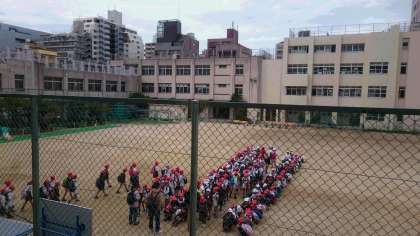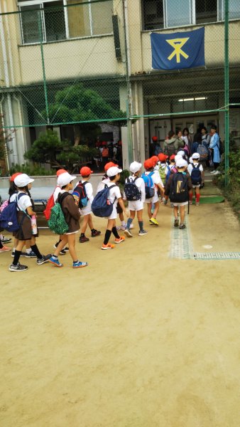 堀江小学校児童、堀江幼稚園園児が鶴見緑地公園に向けて出発しました。