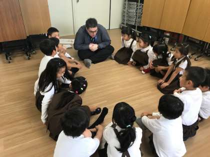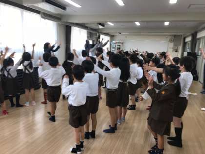 初めに全員で元気よくあいさつをし、「幸せなら手をたたこう」の英語バージョンを振り付けを付けながら楽しく歌いました。その後、グループに分かれて、動物の名前を発音したり、自分の好きな動物を英語で話したり、楽しみながら英語に触れました。みんなニコニコ笑顔でとても盛り上がっていました。