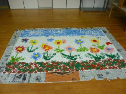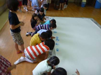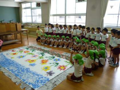堀江幼稚園児と1年生が協同して作成した巨大絵画「〜手と手をつないで〜」が完成しました。