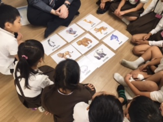 英語出前授業では、楽しく歌を歌ったり、アニマルの名前を覚えるゲームをしたりしました。