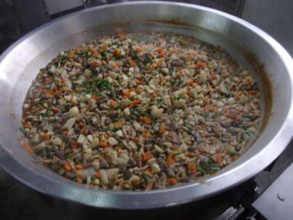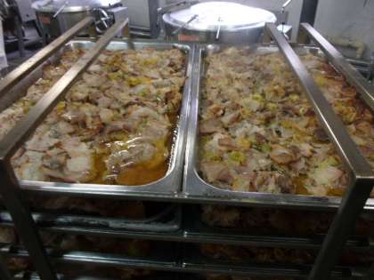 今日の献立は「ごはん、豚肉のねぎじょうゆ焼き、ふきよせ煮、ツナ大豆そぼろ、牛乳」でした。豚肉は小口ぎりにした白ねぎとともにみりんやしょうゆなどで味をつけて焼きました。ふきよせ煮には、これからが旬のれんこんやしめじを使いました。ツナ大豆そぼろは、ツナと大豆のひきわりをいためて作った手作りのふりかけです。大豆のひきわりの食べた時の食感がおいしい一品でした。