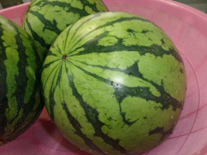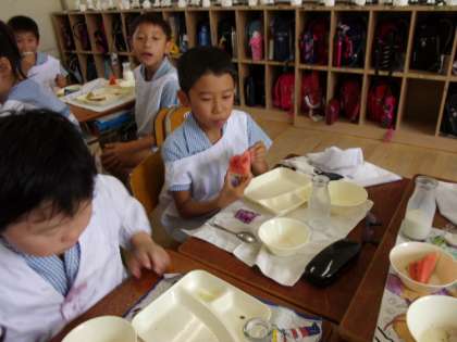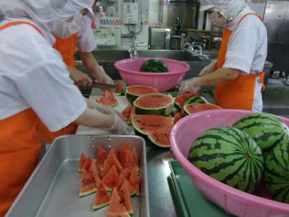 デザートのすいかは、堀江小学校に14個が届きました。とてもきれいな、特上のすいかでした。1個のすいかを64切れに切ります。みんな同じ形に切っていきます。とても甘くて、水分たっぷりのすいかでした。