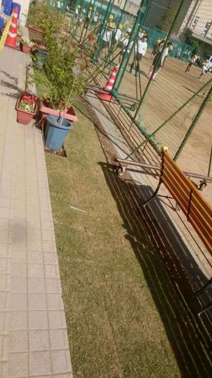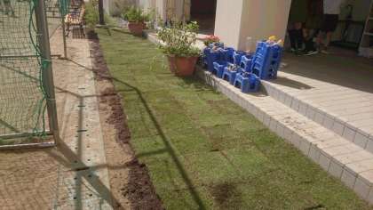 西館1年の教室前に芝生を植えました。