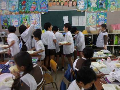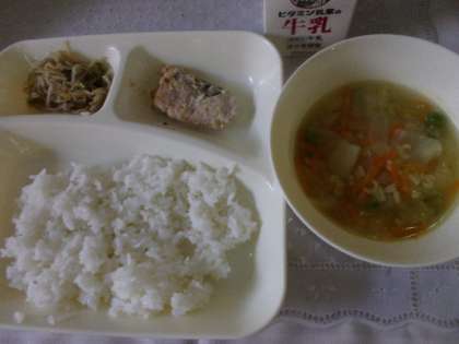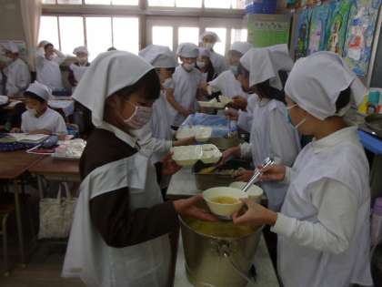 4年生の教室では、決まった手順で着々と配膳が進んでいました。スープを覗き込んでは、「わ!英語が入っている!」と喜んでいました。アルファベットマカロニには、AからZまでのアルファベットと数字があります。食べながら、自分のスープには何が入っているのか探していました。おかわりも、たくさんの人が欲しいので、かつおのおかわりはじゃんけんで決めました。