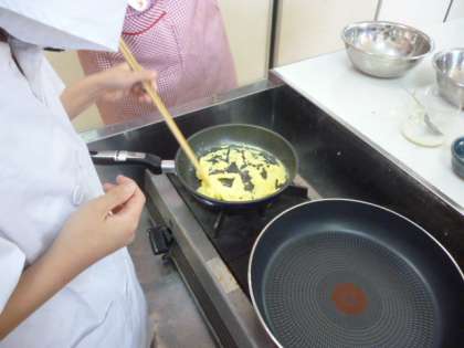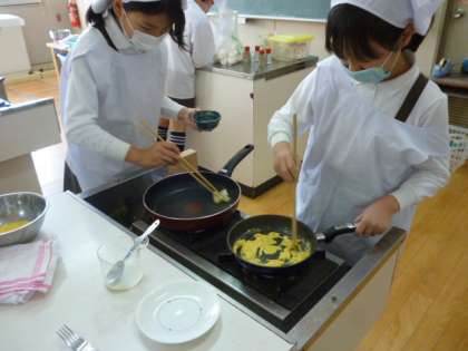 料理クラブは、毎回、縦割りグループで調理実習をしています。今回は初めてフライパンを使いました。慣れた手つきで卵を割って上手にスクランブルエッグを完成させました。