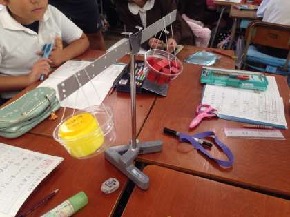 算数の時間に、積み木を使って、身近な文房具の重さを調べました。