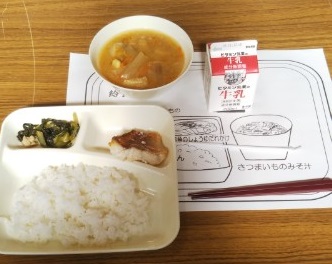 献立は、赤魚のしょうゆだれかけ、さつまいもの味噌汁、大阪しろなの炒め物、牛乳です。