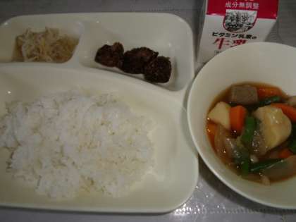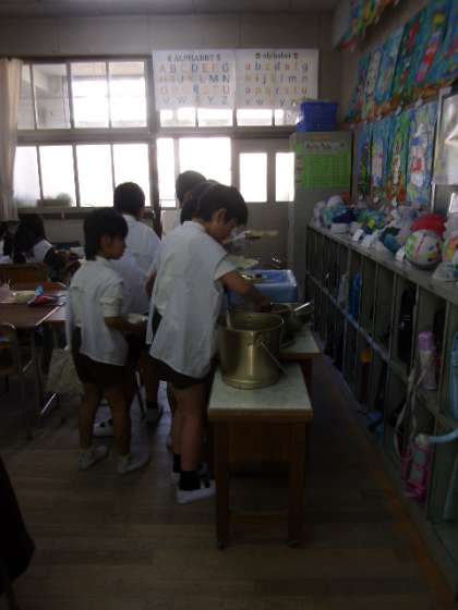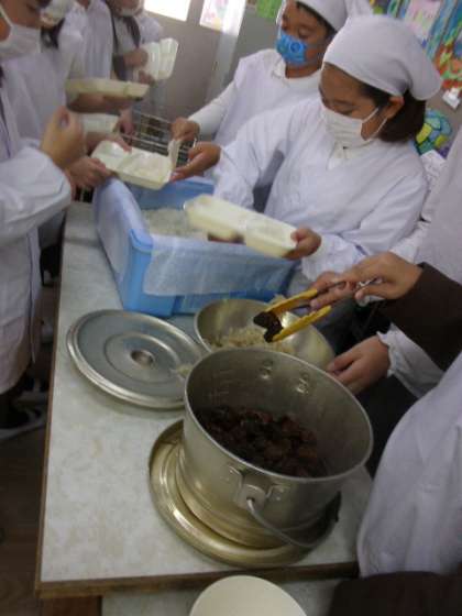 4年生の教室では、「いただきます」をした後、減らしたい人は自分で食べられる量に調整します。どうやら、煮ものに入っているしめじを減らしている人が多いようでした。減らす人がいなくなったら、今度は増やしたい人が増やしにいきますが、くじらのたつたあげが大人気でした。