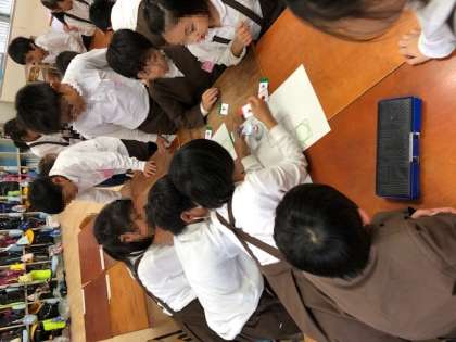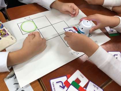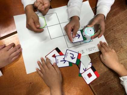 1年生では、アンプラグドロボット(トルゥートルゥー)をつかってプログラミングの学習を行っています。