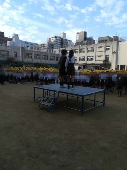 健康委員会の児童が全校朝礼の時に「あわあわガラガラ週間」のお知らせをしています。
