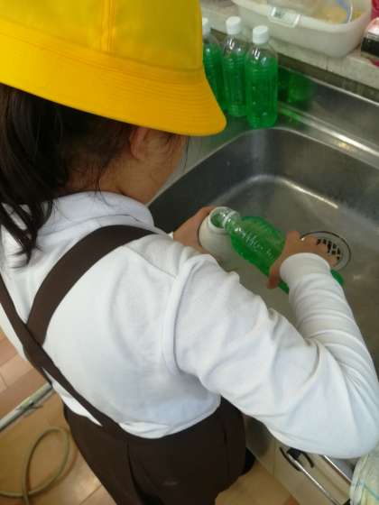 保健係さんが石けん液の補充をしています。