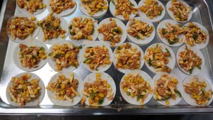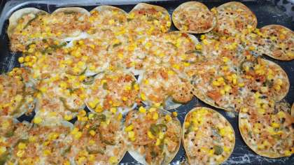 今日の献立は「レーズンパン、豚肉と野菜のスープ煮、変わりピザ、白桃(缶詰)、牛乳」でした。変わりピザは、ギョーザの皮の上に、ツナ、コーン、ピーマン、チーズ、ピザソースを混ぜ合わせた具材を乗せて、焼き物機で焼きました。ホテルパンの上にギョーザの皮は25枚程度しか乗せられないので、50枚ぐらいのホテルパンで焼くのはとても時間がかかりました。