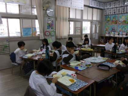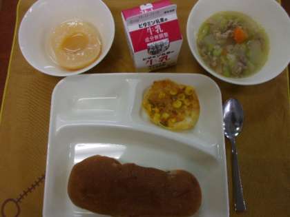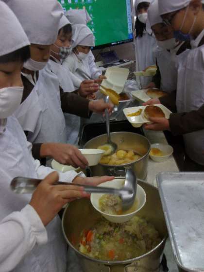 4年生の教室に入ると、豚肉と野菜のスープ煮が、具材とスープを均等に配膳できていなかったようで、最後の方は具材だけでスープがありませんでした。スープの多い人よりスープを回収して、無事配膳が終わりました。白桃は、液汁も好評でおかわりの人がたくさんいました。