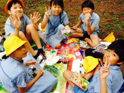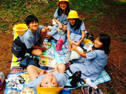 高原で楽しく昼食タイム。自然がいっぱいの場所で食べるお弁当は格別!