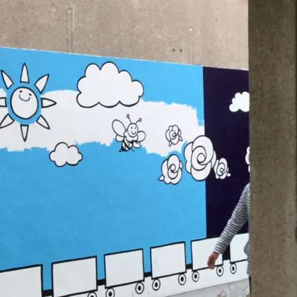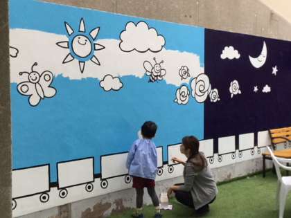 堀江幼稚園の園児たちが、壁面の絵画に挑戦しています。