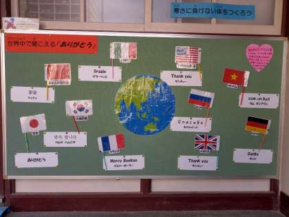 保健室前では、世界各国の「ありがとう」という言葉をたくさん掲示しています。