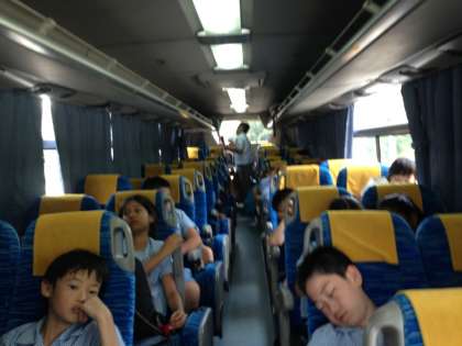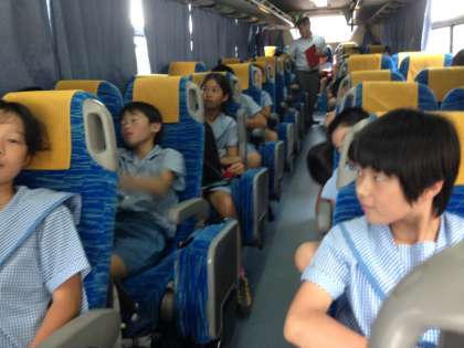 帰りのバスに乗った瞬間から、多くの児童が爆睡しています。よほど疲れたのでしょうね。順調に走っているようです。