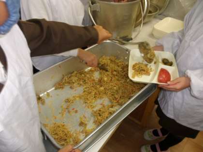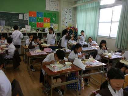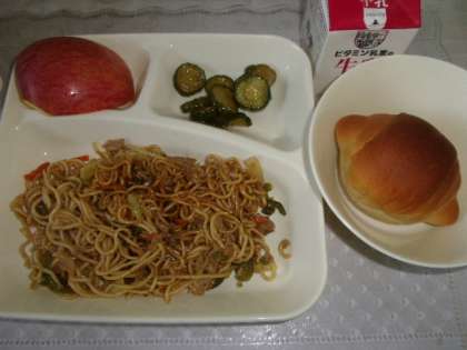 2年生の教室では、給食当番が手慣れた配膳をしていました。おかわりも欲しい人がたくさんいて、りんごもきゅうりも焼きそばもパンも全部なくなりました。今日の焼きそばは、いつもとちょっと味の違う焼きそばでしたが、だれも気付かずに食べ終わったようです。