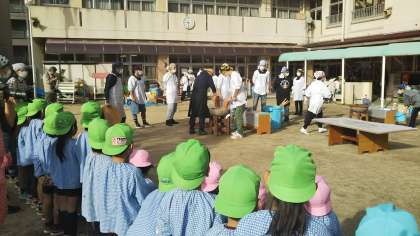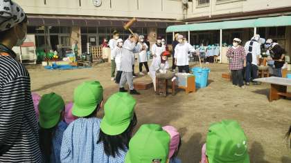 地域の方や保護者の方にお世話をいただきながら、園児たちがお餅つきの体験をしました。