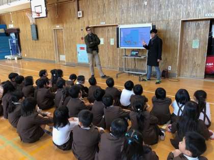 1年生が、大阪大学の留学生の方と交流しました。インドネシアやインドなど外国の文化や歴史に触れました。動物や食事についてのお話のときには、「おいしそう〜」「なんだか、からそう〜」などいろいろな声が上がりました。