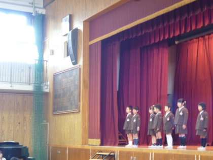 1年生が終業式で「がんばったこと」を発表しました。声の出し方や読み方を何度も練習して、本番では丁寧に発表することができました。