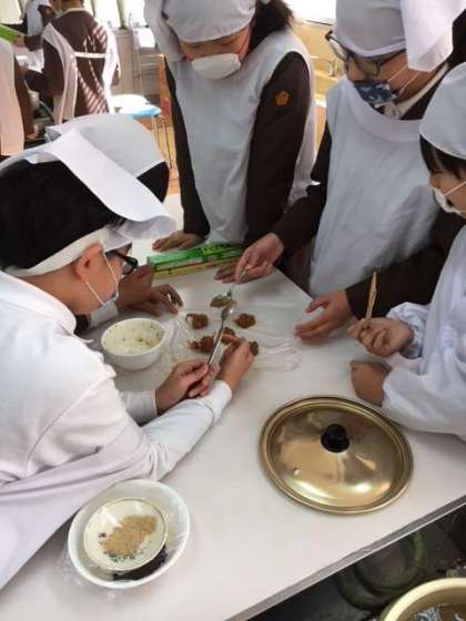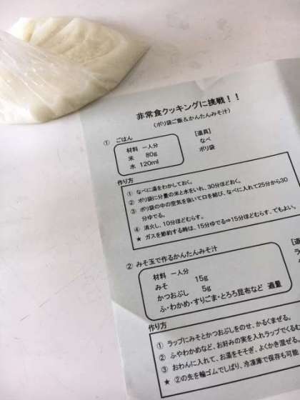今回の調理実習は、「非常食クッキング」でした。これで作れるのかなぁと思いながら協力して実習をしていました。できあがったおにぎりとみそ汁はとても美味しくかったです。「災害の時にこんなにおいしいごはんとみそ汁が食べれるなんて贅沢だ」といった感想があるくらいでした。