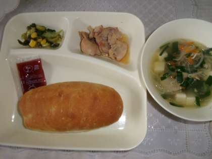 今日から、3学期の給食が始まりました。今日の献立は、「コッペパン、いちごジャム、鶏肉のオイスターソース焼き、糸寒天のスープ、チンゲンサイとコーンの中華あえ、牛乳」でした。スープには、糸寒天の他にとうふやたまねぎ、もやし、にんじん、にらなどたくさんの具が入りました。糸寒天の独特の食感を楽しめるスープでした。