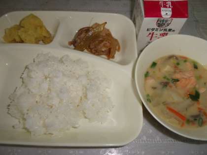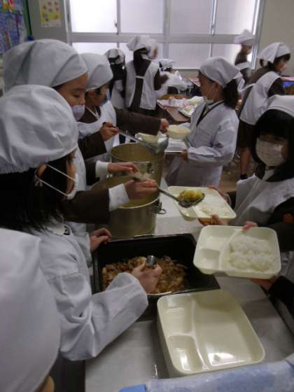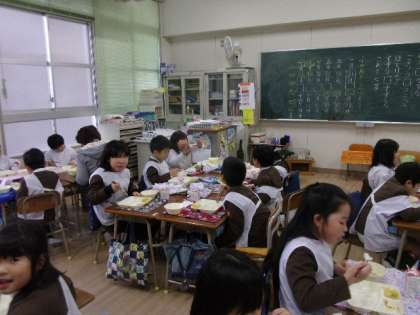 2年生の教室では、手慣れた様子で配膳が進んでいました。でも、くりきんとんがたくさん残ってしまったので、「もっとほしい人は来てください。」と先生が声をかけると、たくさんの人が、大盛にしてもらってにっこりしながら席に戻りました。
