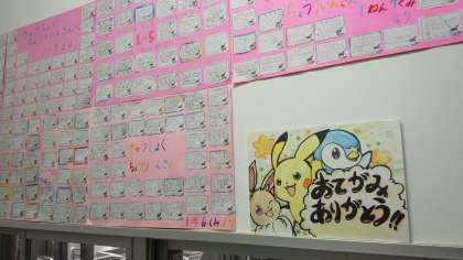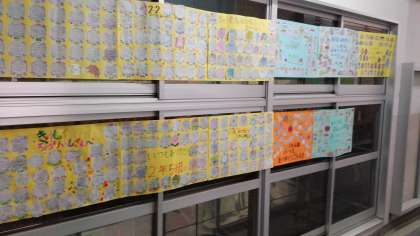 月曜日の集会で、各クラスからいただいたメッセージを、給食室に掲示しました。とってもかわいらしくてうれしいことが書いてあるので、給食室だけでなくたくさんの人に読んでもらえるとうれしいです。