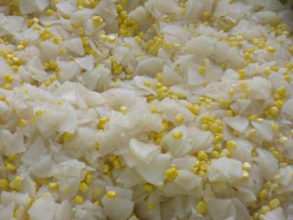 今日の献立は「まぐろのしょうゆマヨネーズ焼き、鶏肉とじゃがいものスープ煮、だいこんのサラダ、牛乳」でした。角切りのまぐろは白ねぎを合わせて、しょうゆとマヨネーズで味付けをして焼きもの機で焼きました。サラダはだいこんとコーンを使い、酸味はワインビネガーを使いました。鶏肉とじゃがいものスープ煮には、花とハートの形をしたラッキーにんじんが入っていました。