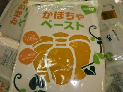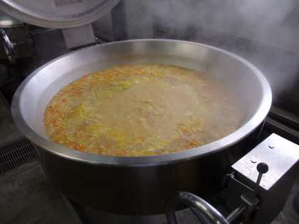 今日の献立は「コッペパン、アプリコットジャム、牛肉のデミグラスソース煮、コーンスープ、かぼちゃのプリン、牛乳」でした。かぼちゃのプリンは、かぼちゃのペーストを使った手作りのデザートです。ふっくら、こんがりと焼きあがりました。コーンスープは、冷凍の北海道産の粒状のコーンと缶詰のスイートコーンを使いました。大きな釜3つを使って作りました。