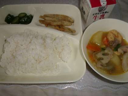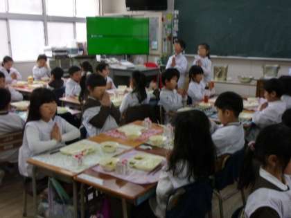 1年生の教室では、「いただきます。」をすると、この魚には骨があるのか、ないのかと話をする声がしていました。でも、魚が苦手な人も、骨まで食べられるので大人気でした。ごはんも、牛乳も、煮ものも、きゅうりもみんなでおかわりをしたので、空っぽになりました。