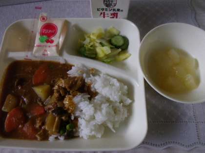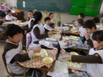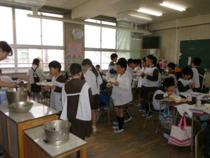 今日は堀江小学校で1番人気のあるカレーライスなので、給食当番もうれしそうに配膳をしていました。みんなで「いただきます。」をすると、グループで楽しそうに食べ始めました。残っているカレーのおかわりをする人がたくさんいて、長い列ができました。