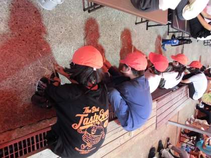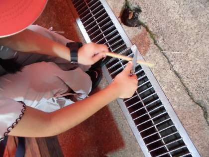 あらかじめ1人分に切り分けていただいた竹を半分に割り2本にします。後は、ナイフで削り角をとりはしの形にしていきます。1本を作るのに30分、2本で1時間かかります。はじめは削り方が分からず苦労していましたが、しだいに慣れもくもくと削っていました。