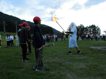 この心の込められた火が、火の神から火の使いに、火の使いから火の精霊に分火され、薪に点火されました。その火は大きな炎となりました。この炎を160人を超える子どもたちが囲み「燃えろよ燃えろ」を歌いました。