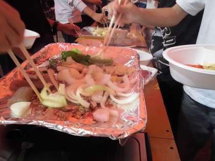 コンロに火を入れ、いよいよ焼き始めます。お肉から焼くか野菜から焼くか・・・・・。