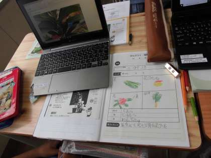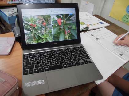 理科の学習で、ホウセンカの成長の様子を学習者用端末で撮影した写真をもとに、ワークシートにまとめました。子どもたちは、写真をじっくり見ながら、1学期の成長の過程や夏休み中に咲いた花の様子を確認していました。