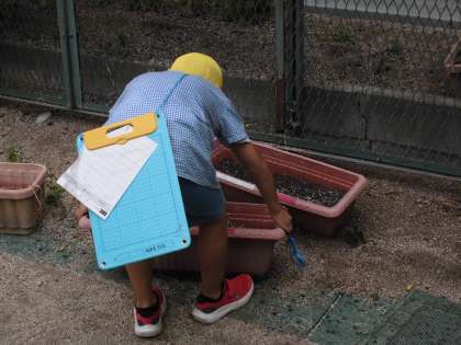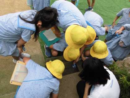 子どもたちは、側溝の中、プランターの下などを詳しく調べました。