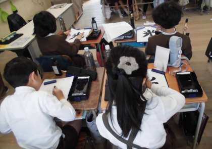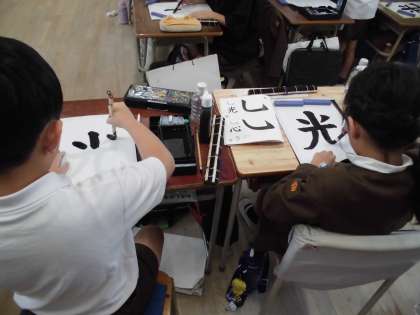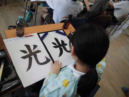 「光」という字を書きました。これまで学習した「とめ」「はね」「はらい」などに加え、6画目の曲がりを意識して書きました。鉛筆と違い、筆の毛先の力加減に苦戦している子どももいました。清書の2枚から、どちらが上手に書けているか友達とお互いに見合って提出していました。
