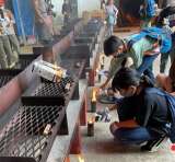 丁寧に具材を詰めて、焼き始めます。