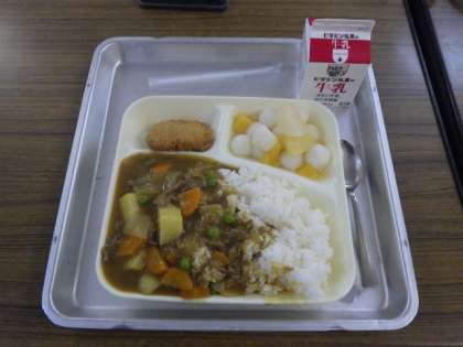 カツカレーライス、フルーツ白玉、牛乳がでました。