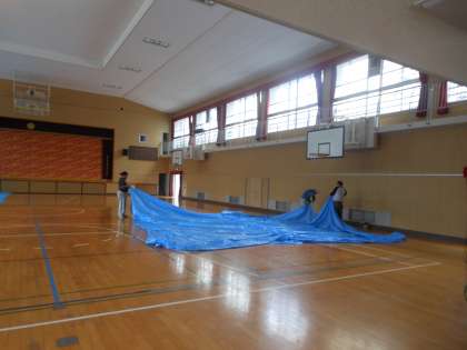 体育館内、環境測定作業が終了し、