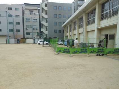 運動場の一部に、作業車が入っていますが、