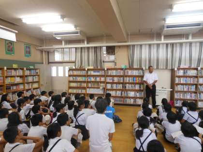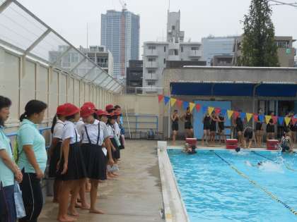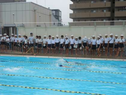 校長先生のお話を聞いた後、水泳の授業を