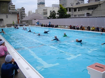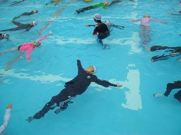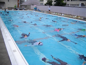 5・6年合同で着衣泳に取り組みました。あわてず水に浮くことが大切です。