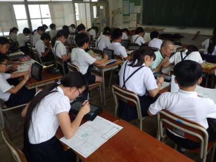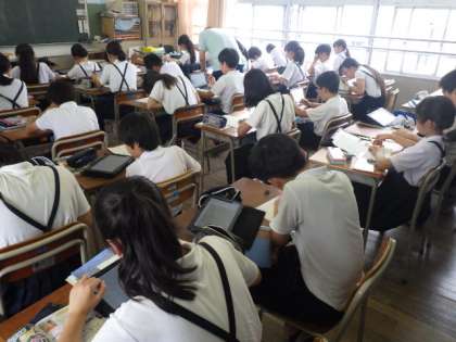タブレットを使い、自分で調べたことを新聞にまとめています。