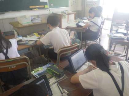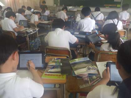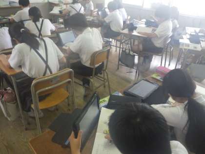タブレットを使って沖縄の産業を調べています。