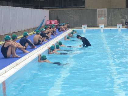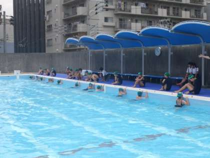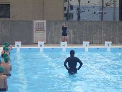 今日の5年生の水泳学習はインストラクターの先生に来ていただき、一緒に学習しました。