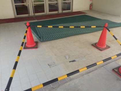 施設開放等で講堂を使用する際には問題ありませんが、講堂前のタイルが破損しています。
