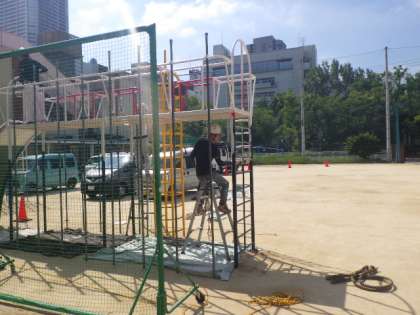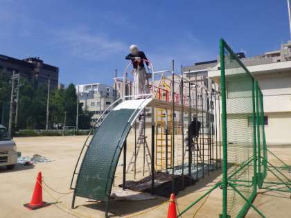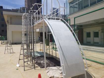 点検し、補修したコンビネーション遊具の塗装を行っています。